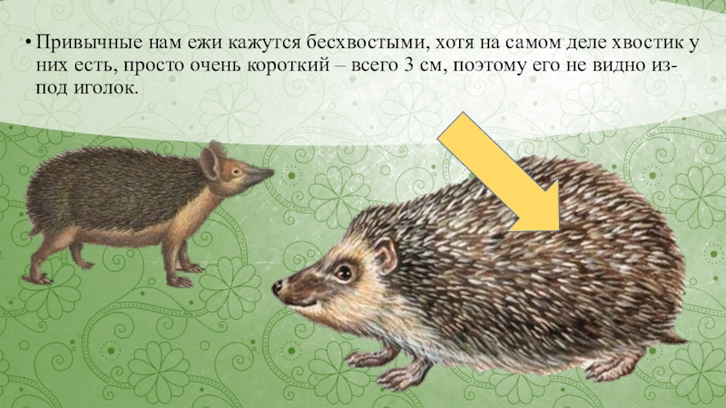 Слайд 9Привычные нам ежи кажутся бесхвостыми, хотя на самом деле хвостик у