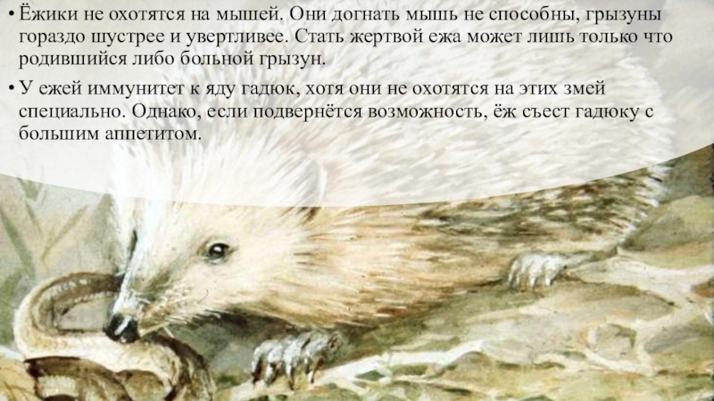 Слайд 3Ёжики не охотятся на мышей. Они догнать мышь не способны, грызуны