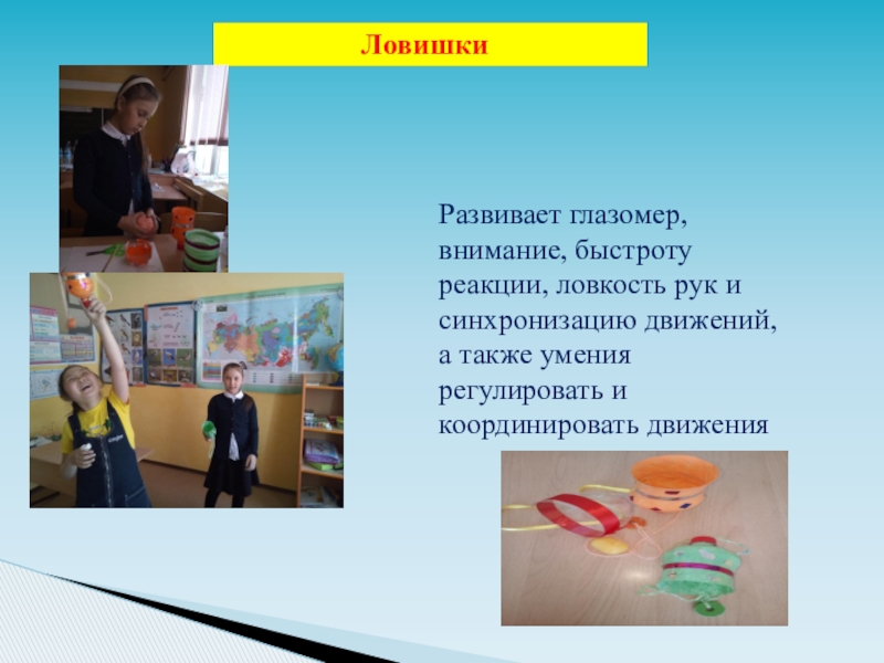 Развивает глазомер, внимание, быстроту реакции, ловкость рук и синхронизацию движений, а также умения регулировать и координировать движения
