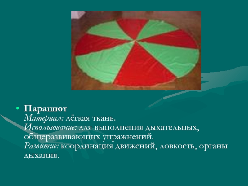 Слайд 24Парашют  Материал: лёгкая ткань. Использование: для выполнения дыхательных, общеразвивающих упражнений. Развитие: координация движений, ловкость, органы дыхания.