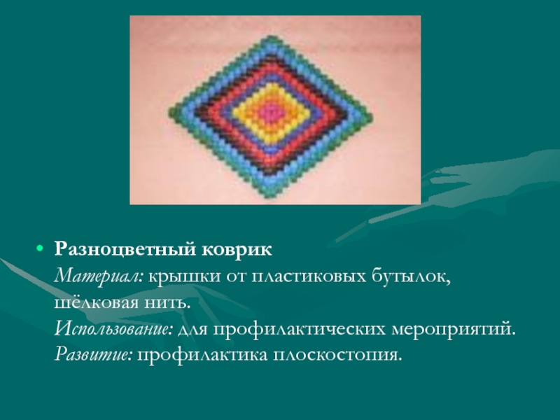 Слайд 6Разноцветный коврик Материал: крышки от пластиковых бутылок, шёлковая нить. Использование: для профилактических мероприятий. Развитие: профилактика плоскостопия.