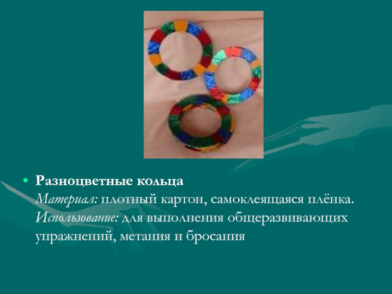Слайд 10Разноцветные кольца Материал: плотный картон, самоклеящаяся плёнка. Использование: для выполнения общеразвивающих упражнений, метания и бросания
