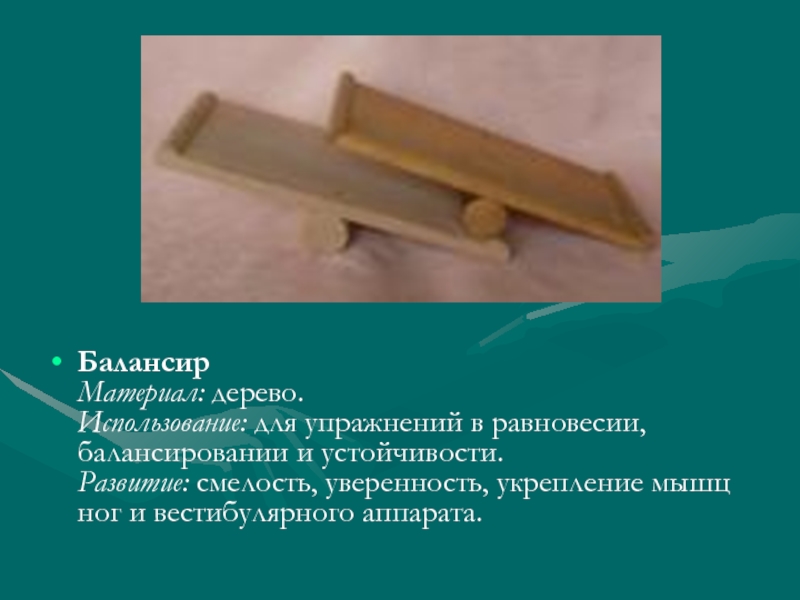 Слайд 17Балансир Материал: дерево. Использование: для упражнений в равновесии, балансировании и устойчивости. Развитие: смелость, уверенность, укрепление мышц ног
