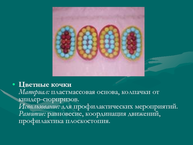 Слайд 12Цветные кочки Материал: пластмассовая основа, колпачки от киндер-сюрпризов. Использование: для профилактических мероприятий. Развитие: равновесие, координация движений, профилактика
