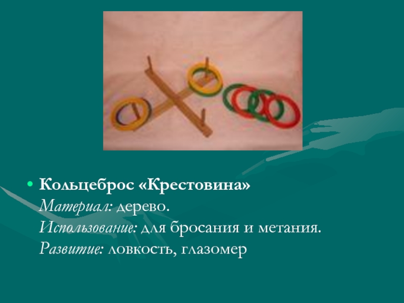 Слайд 16Кольцеброс «Крестовина» Материал: дерево. Использование: для бросания и метания. Развитие: ловкость, глазомер