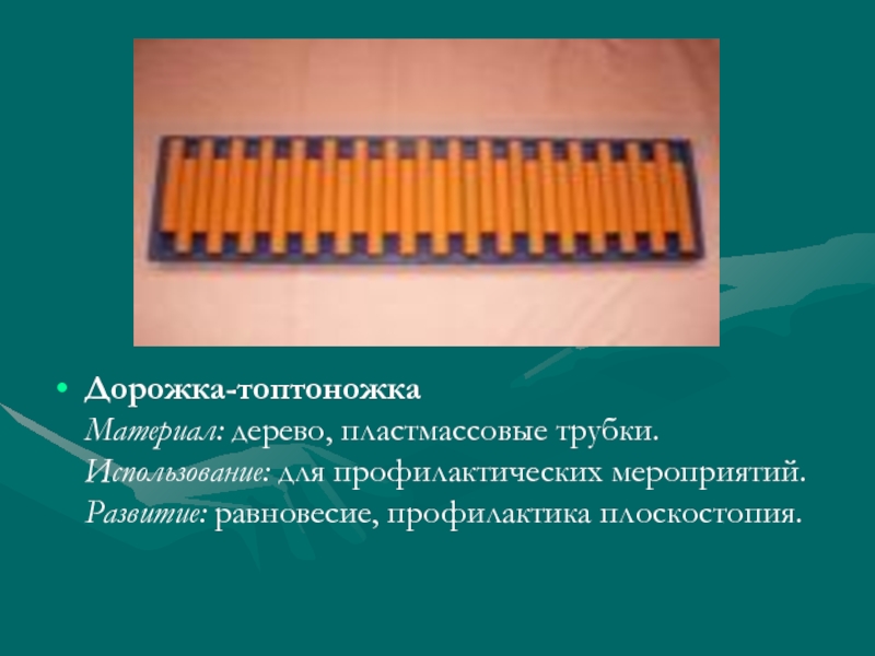 Слайд 3Дорожка-топтоножка Материал: дерево, пластмассовые трубки. Использование: для профилактических мероприятий. Развитие: равновесие, профилактика плоскостопия.