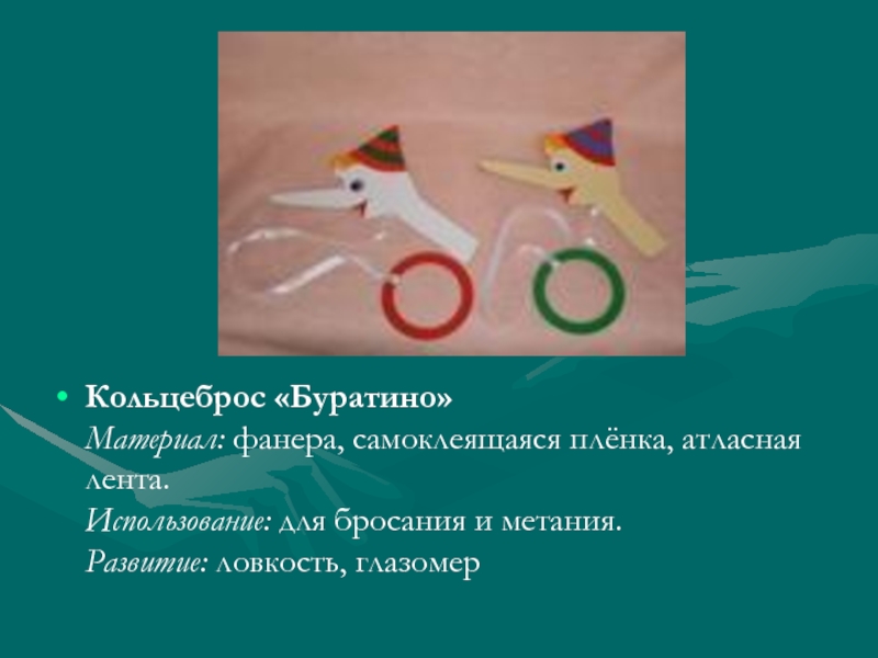 Слайд 14Кольцеброс «Буратино» Материал: фанера, самоклеящаяся плёнка, атласная лента. Использование: для бросания и метания. Развитие: ловкость, глазомер
