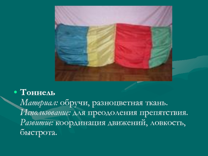Слайд 8Тоннель  Материал: обручи, разноцветная ткань. Использование: для преодоления препятствия. Развитие: координация движений, ловкость, быстрота.