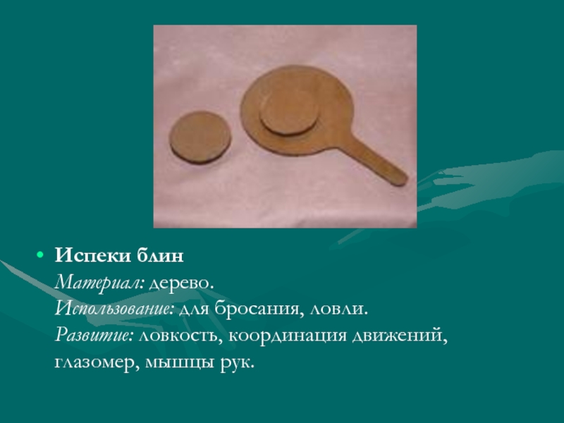 Слайд 15Испеки блин Материал: дерево. Использование: для бросания, ловли. Развитие: ловкость, координация движений, глазомер, мышцы рук.
