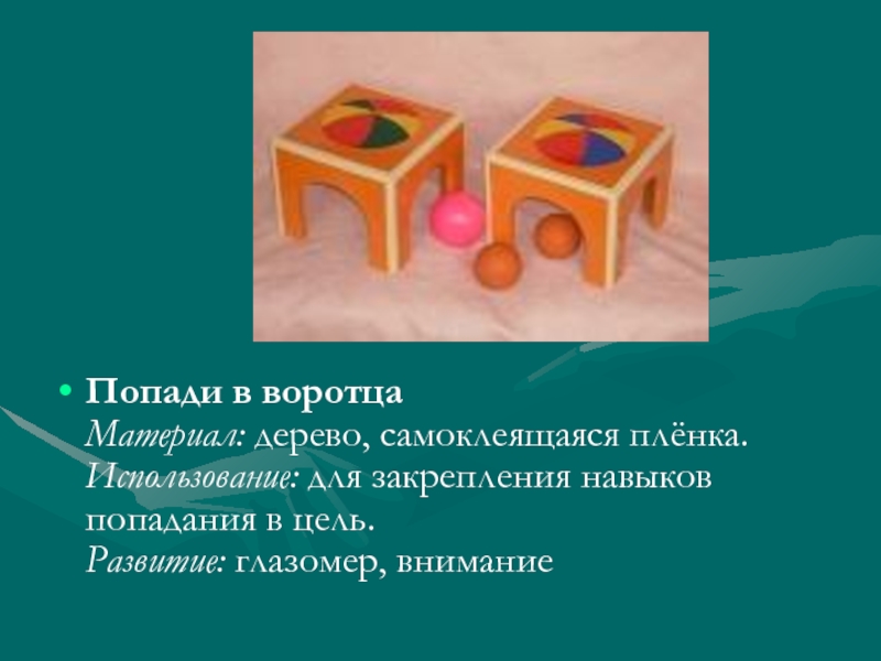 Слайд 20Попади в воротца Материал: дерево, самоклеящаяся плёнка. Использование: для закрепления навыков попадания в цель. Развитие: глазомер, внимание