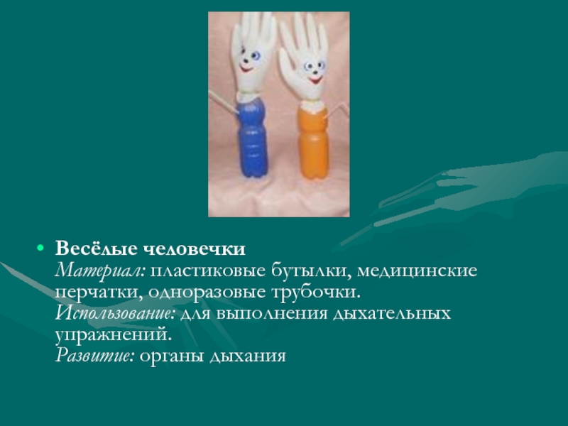 Слайд 23Весёлые человечки Материал: пластиковые бутылки, медицинские перчатки, одноразовые трубочки. Использование: для выполнения дыхательных упражнений. Развитие: органы дыхания