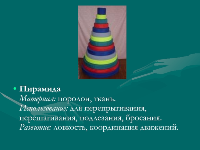 Слайд 18Пирамида Материал: поролон, ткань. Использование: для перепрыгивания, перешагивания, подлезания, бросания. Развитие: ловкость, координация движений.