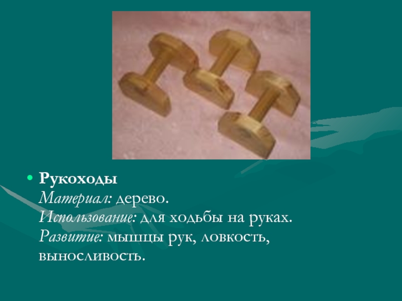 Слайд 26Рукоходы Материал: дерево. Использование: для ходьбы на руках. Развитие: мышцы рук, ловкость, выносливость.