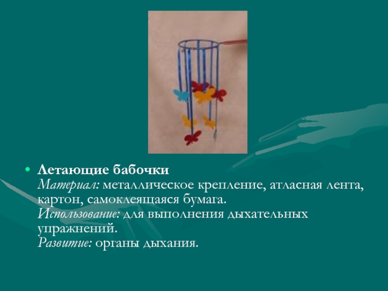 Слайд 22Летающие бабочки Материал: металлическое крепление, атласная лента, картон, самоклеящаяся бумага.  Использование: для выполнения дыхательных упражнений. Развитие: органы