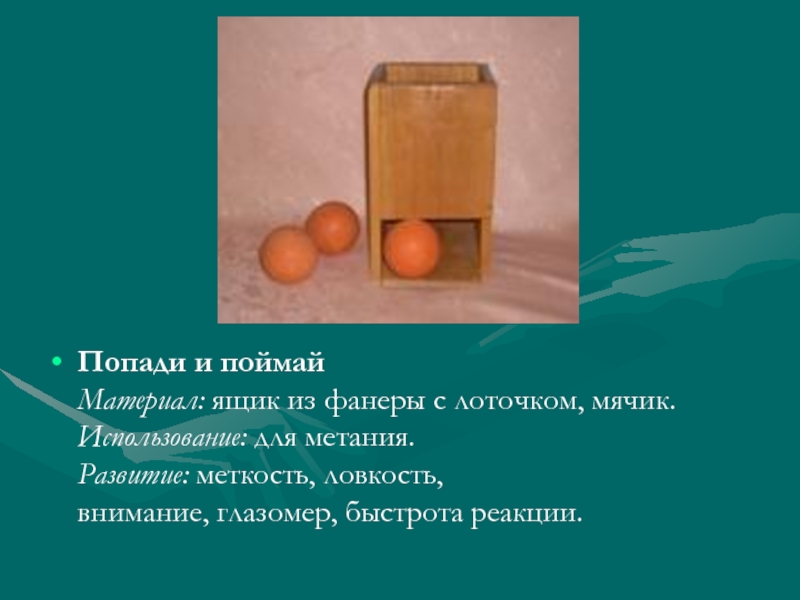 Слайд 13Попади и поймай Материал: ящик из фанеры с лоточком, мячик. Использование: для метания. Развитие: меткость, ловкость,  внимание, глазомер,
