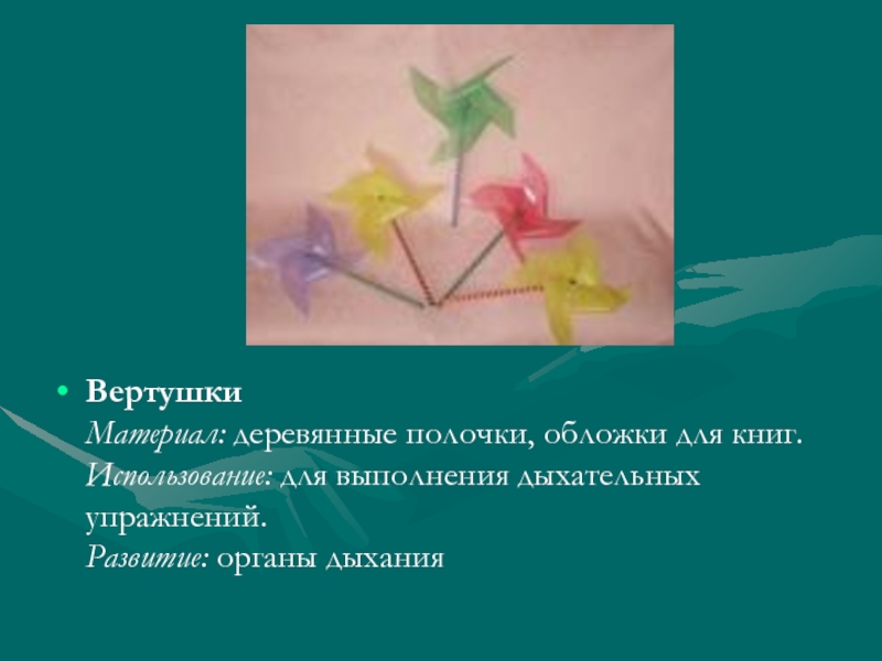 Слайд 25Вертушки  Материал: деревянные полочки, обложки для книг. Использование: для выполнения дыхательных упражнений. Развитие: органы дыхания