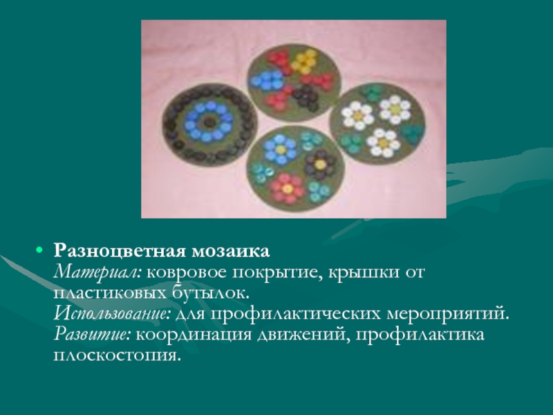 Слайд 5Разноцветная мозаика Материал: ковровое покрытие, крышки от пластиковых бутылок. Использование: для профилактических мероприятий. Развитие: координация движений, профилактика
