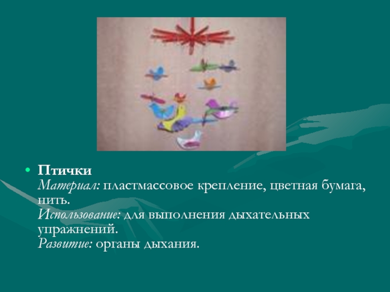 Слайд 21Птички Материал: пластмассовое крепление, цветная бумага, нить. Использование: для выполнения дыхательных упражнений. Развитие: органы дыхания.