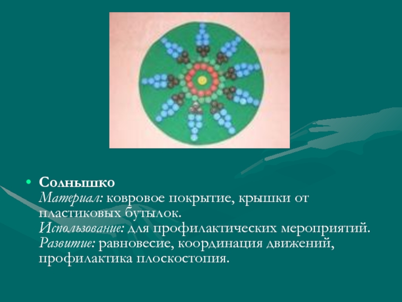 Слайд 2Солнышко Материал: ковровое покрытие, крышки от пластиковых бутылок. Использование: для профилактических мероприятий. Развитие: равновесие, координация движений, профилактика