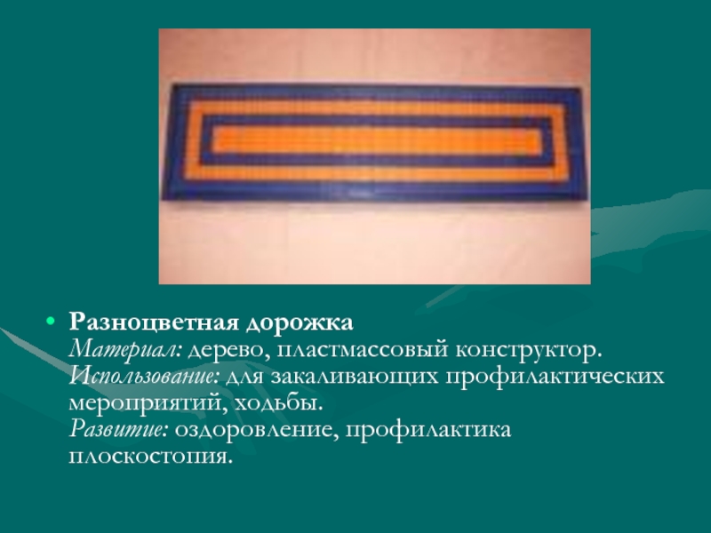 Слайд 4Разноцветная дорожка Материал: дерево, пластмассовый конструктор. Использование: для закаливающих профилактических мероприятий, ходьбы. Развитие: оздоровление, профилактика плоскостопия.