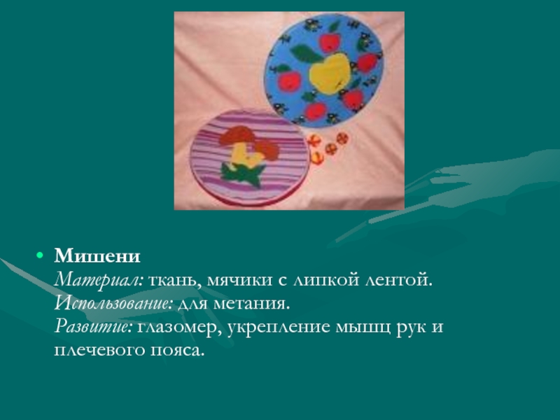 Слайд 19Мишени Материал: ткань, мячики с липкой лентой. Использование: для метания. Развитие: глазомер, укрепление мышц рук и плечевого