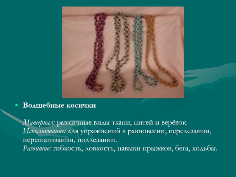 Слайд 9Волшебные косички Материал: различные виды ткани, нитей и верёвок. Использование: для упражнений в равновесии, перелезании,