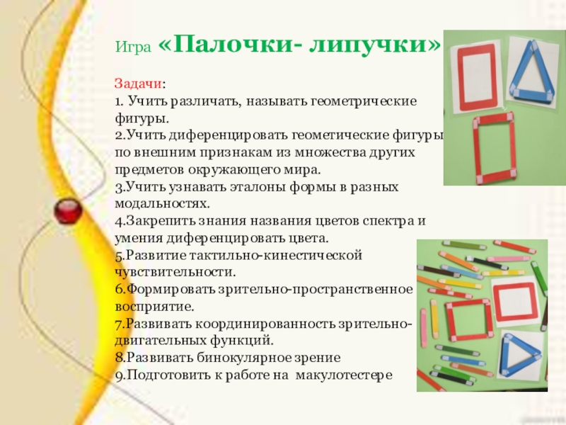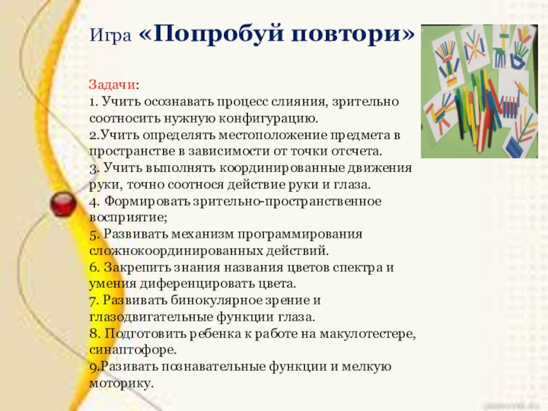 1. Учить осознавать процесс слияния, зрительно соотносить нужную конфигурацию.