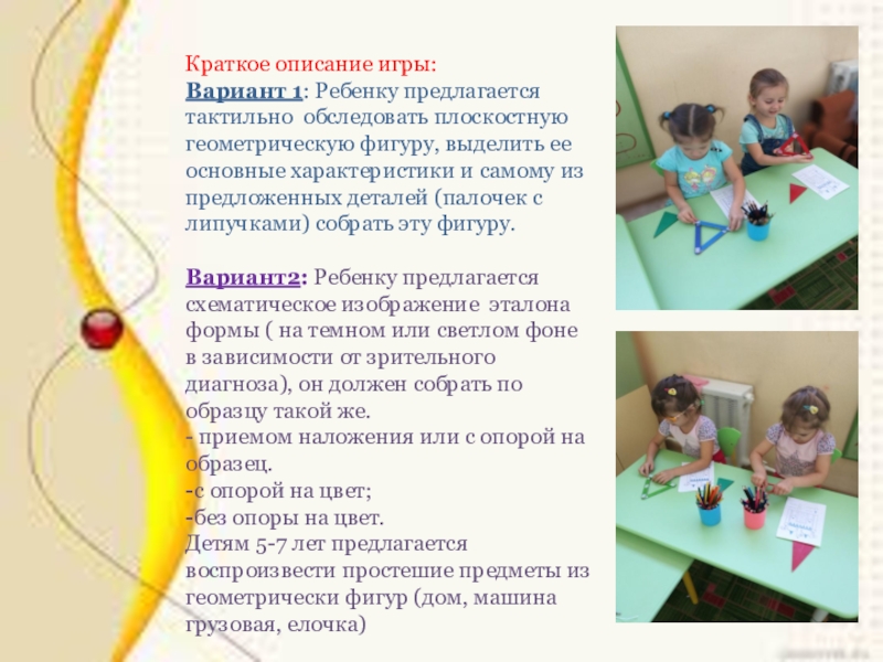 Вариант2: Ребенку предлагается схематическое изображение эталона формы ( на темном или светлом фоне в зависимости от зрительного диагноза), он должен собрать по образцу такой же.