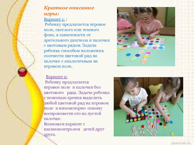 игровое поле и палочки без цветового ряда. Задача ребенка с помощью зрения выделить любой цветовой ряд на игровом поле и визомоторно самому воспроизвести его на пустой палочке.
