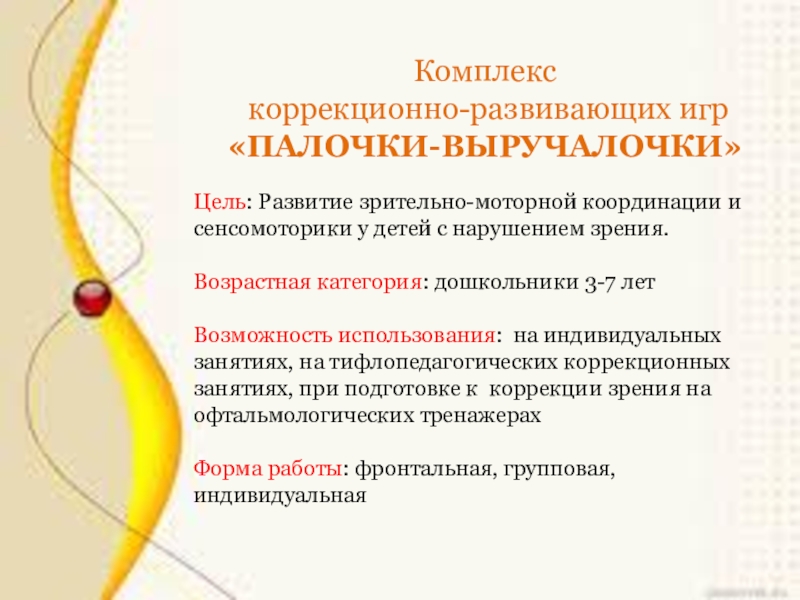 Возможность использования: на индивидуальных занятиях, на тифлопедагогических коррекционных занятиях, при подготовке к коррекции зрения на офтальмологических тренажерах