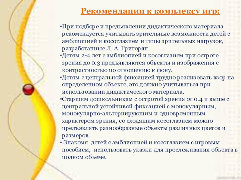 Детям с центральной фиксацией трудно реализовать взор на определенном объекте, это должно учитываться при использовании дидактического материала.