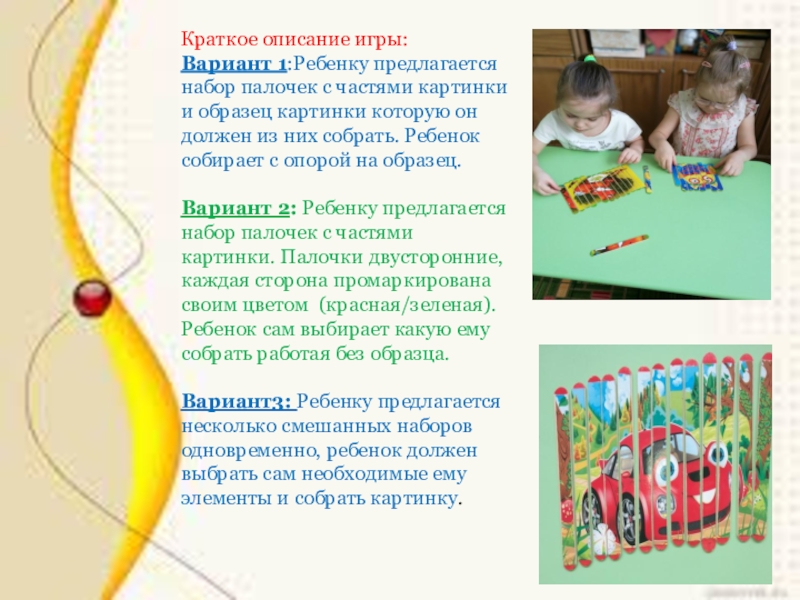 Вариант 2: Ребенку предлагается набор палочек с частями картинки. Палочки двусторонние, каждая сторона промаркирована своим цветом (красная/зеленая).Ребенок сам выбирает какую ему собрать работая без образца.