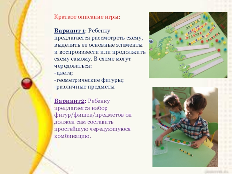 Вариант2: Ребенку предлагается набор фигур/фишек/предметов он должен сам составить простейшую чередующуюся комбинацию.