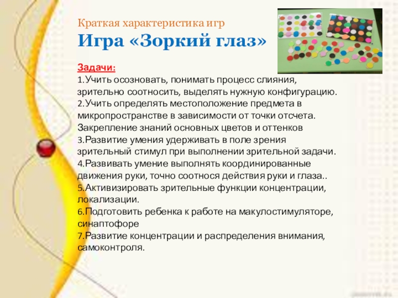 4.Активизировать зрительные функции концентрации, фиксации, локализации.