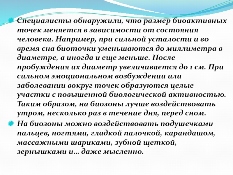 Слайд 31Специалисты обнаружили, что размер биоактивных точек меняется в зависимости от состояния