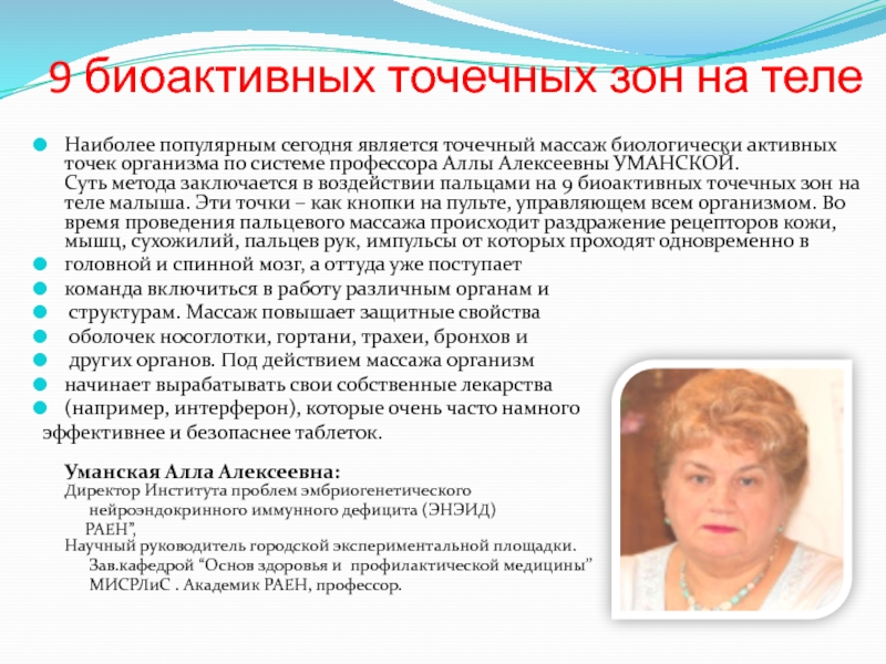 массаж биологически активных точек организма по системе профессора Аллы Алексеевны УМАНСКОЙ.