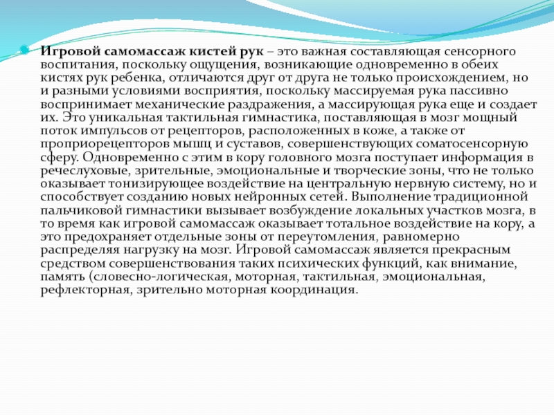 ощущения, возникающие одновременно в обеих кистях рук ребенка, отличаются друг от друга не только происхождением, но и разными условиями восприятия, поскольку массируемая рука пассивно воспринимает механические раздражения, а массирующая рука еще и создает их. Это уникальная тактильная гимнастика, поставляющая в мозг мощный поток импульсов от рецепторов, расположенных в коже, а также от проприорецепторов мышц и суставов, совершенствующих соматосенсорную сферу. Одновременно с этим в кору головного мозга поступает информация в речеслуховые, зрительные, эмоциональные и творческие зоны, что не только оказывает тонизирующее воздействие на центральную нервную систему, но и способствует созданию новых нейронных сетей. Выполнение традиционной пальчиковой гимнастики вызывает возбуждение локальных участков мозга, в то время как игровой самомассаж оказывает тотальное воздействие на кору, а это предохраняет отдельные зоны от переутомления, равномерно распределяя нагрузку на мозг. Игровой самомассаж является прекрасным средством совершенствования таких психических функций, как внимание, память (словесно-логическая, моторная, тактильная, эмоциональная, рефлекторная, зрительно моторная координация.
