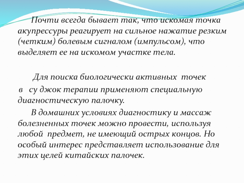 точка акупрессуры реагирует на сильное нажатие резким (четким) болевым сигналом (импульсом), что выделяет ее на искомом участке тела.