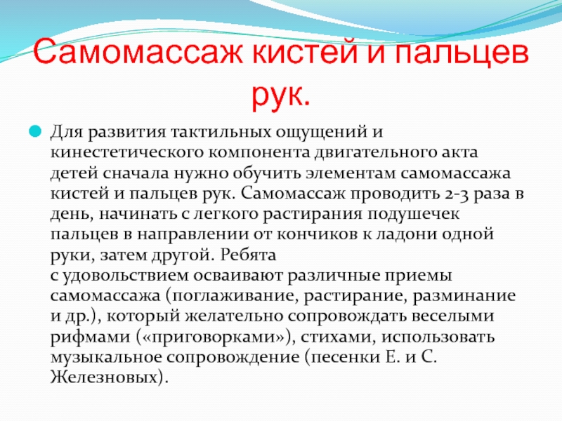 с удовольствием осваивают различные приемы самомассажа (поглаживание, растирание, разминание и др.), который желательно сопровождать веселыми рифмами («приговорками»), стихами, использовать музыкальное сопровождение (песенки Е. и С.Железновых).