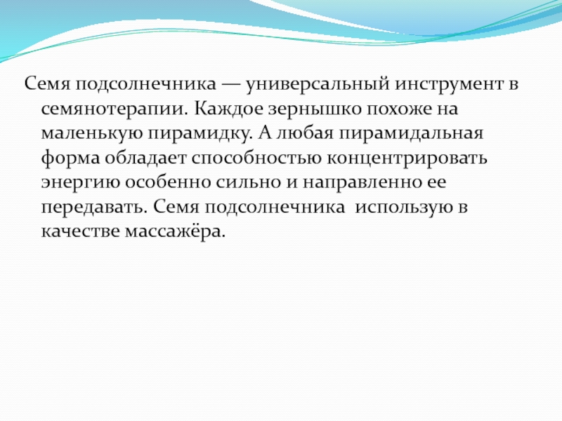маленькую пирамидку. А любая пирамидальная форма обладает способностью концентрировать энергию особенно сильно и направленно ее передавать. Семя подсолнечника использую в качестве массажёра.