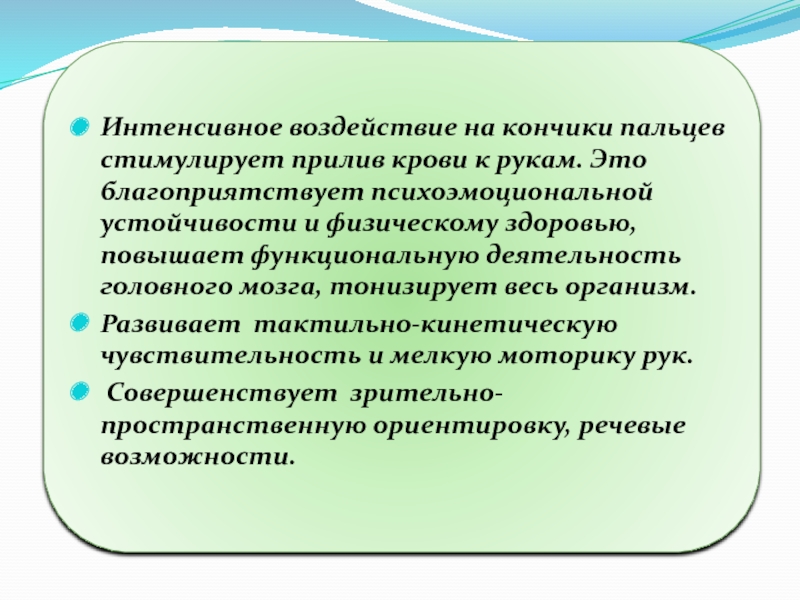 Интенсивное воздействие на кончики пальцев стимулирует прилив крови к рукам. Это