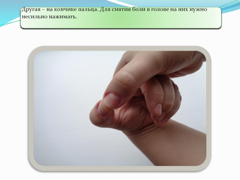 Слайд 16Другая – на кончике пальца. Для снятия боли в голове на