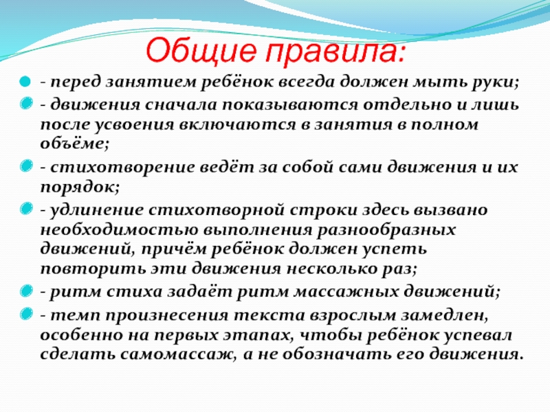 - темп произнесения текста взрослым замедлен, особенно на первых этапах, чтобы ребёнок успевал сделать самомассаж, а не обозначать его движения.