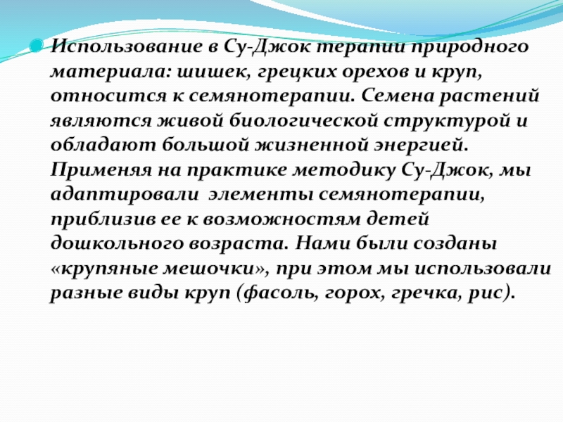 Применяя на практике методику Су-Джок, мы адаптировали элементы семянотерапии, приблизив ее к возможностям детей дошкольного возраста. Нами были созданы «крупяные мешочки», при этом мы использовали разные виды круп (фасоль, горох, гречка, рис).