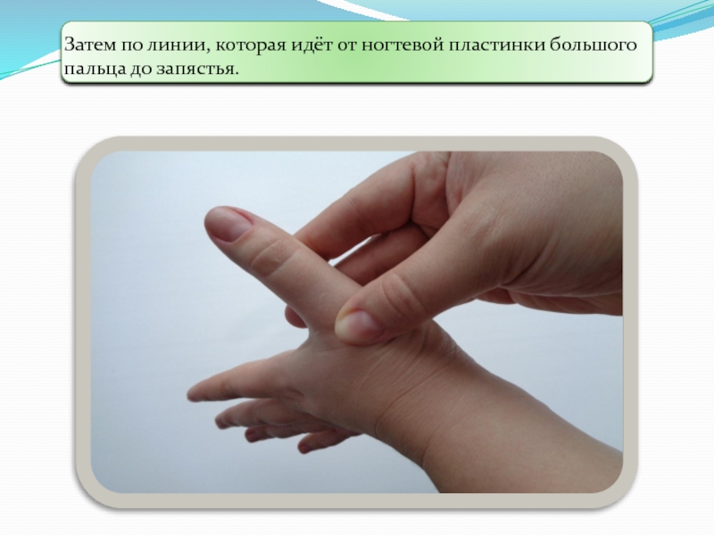 Слайд 19Затем по линии, которая идёт от ногтевой пластинки большого пальца до
