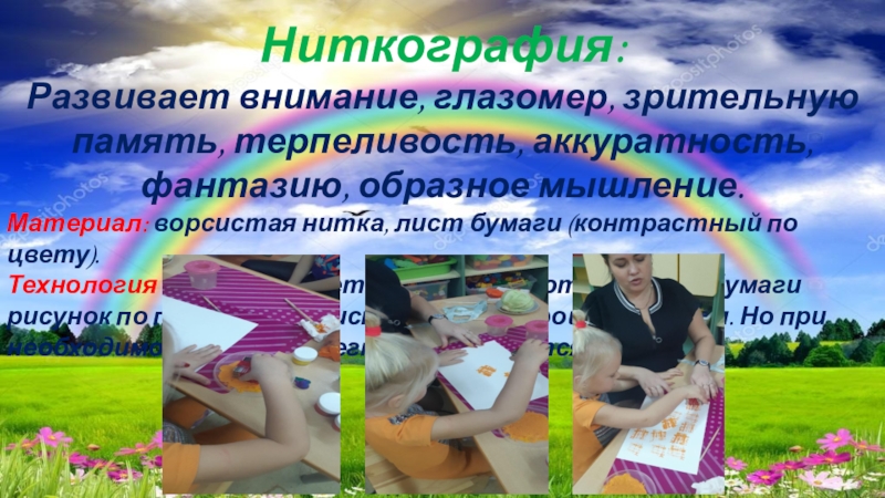 Технология рисования: дети выкладывают на листе бумаги рисунок по памяти. Ворсистая нитка хорошо ложится. Но при необходимости так же легко поправляется.