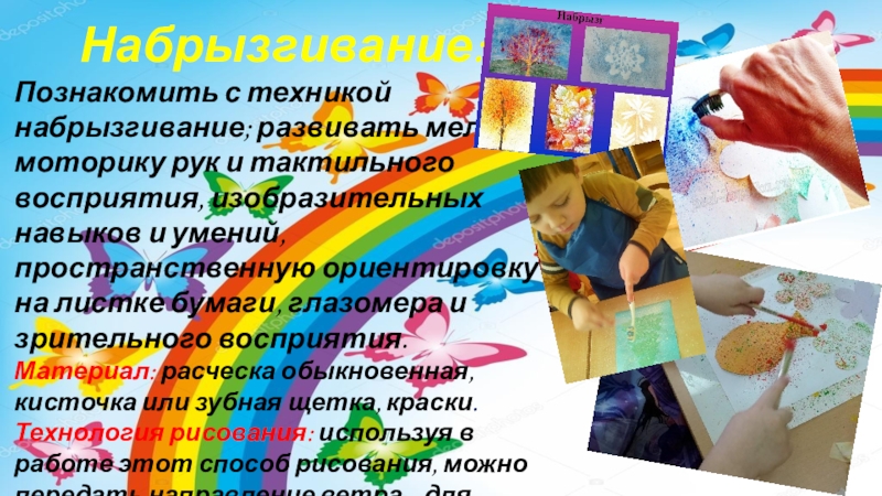 Познакомить с техникой набрызгивание; развивать мелкую моторику рук и тактильного восприятия,