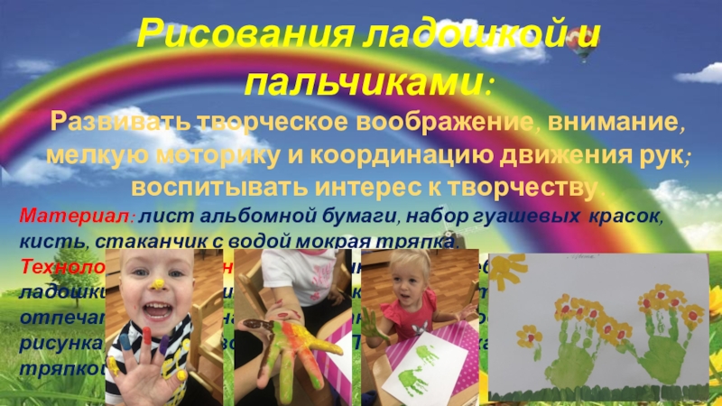 Технология рисования: посредине листа ребенок рисует ребром ладошки, или ладошкой, пальчиками. Макает в краску и отпечатывается на бумаге так, как необходимо для того рисунка, какой он изображает. Потом краска вытирается тряпкой.
