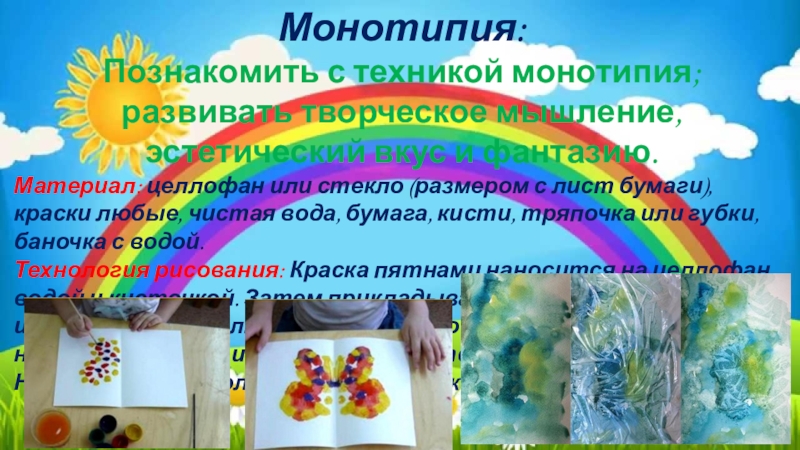 Познакомить с техникой монотипия; развивать творческое мышление, эстетический вкус и фантазию.