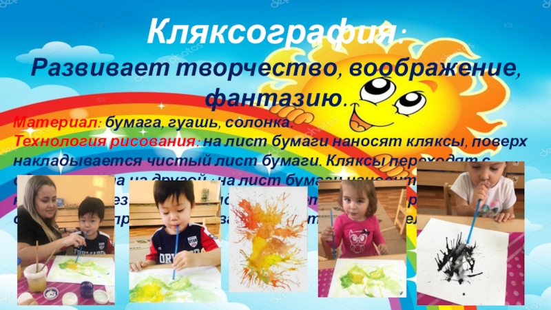 бумаги наносят кляксы, поверх накладывается чистый лист бумаги. Кляксы переходят с одного листа на другой ; на лист бумаги наносится капли краски и через солонку выдуваем. Дети рассматривают детали или просто называют то, что они увидели..